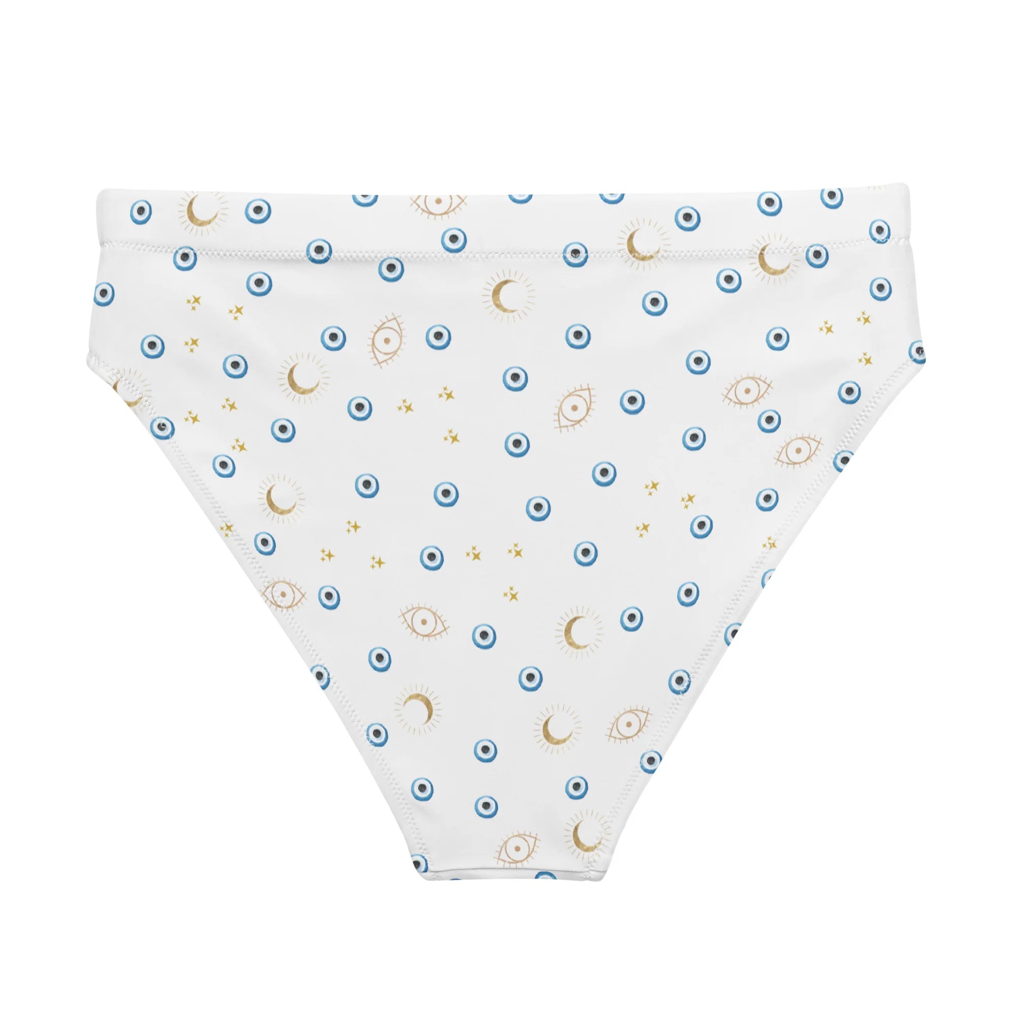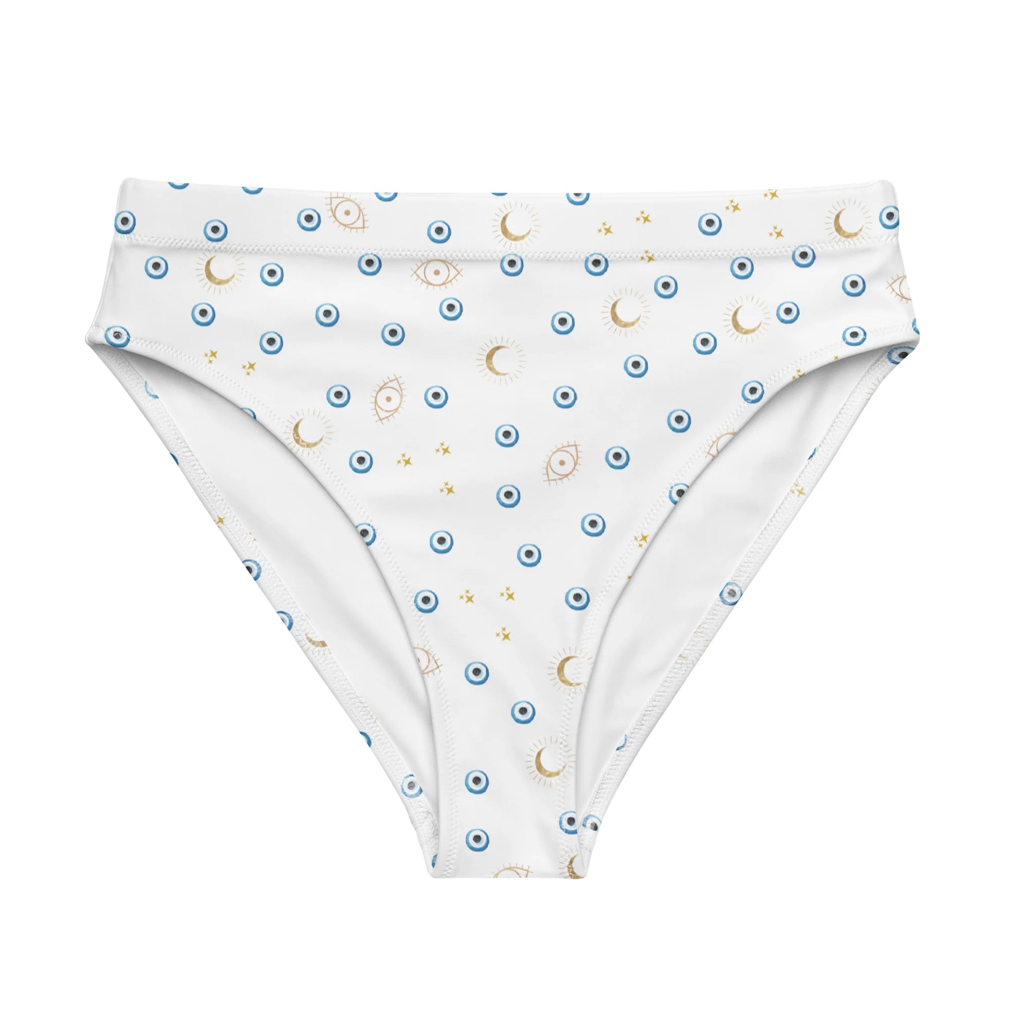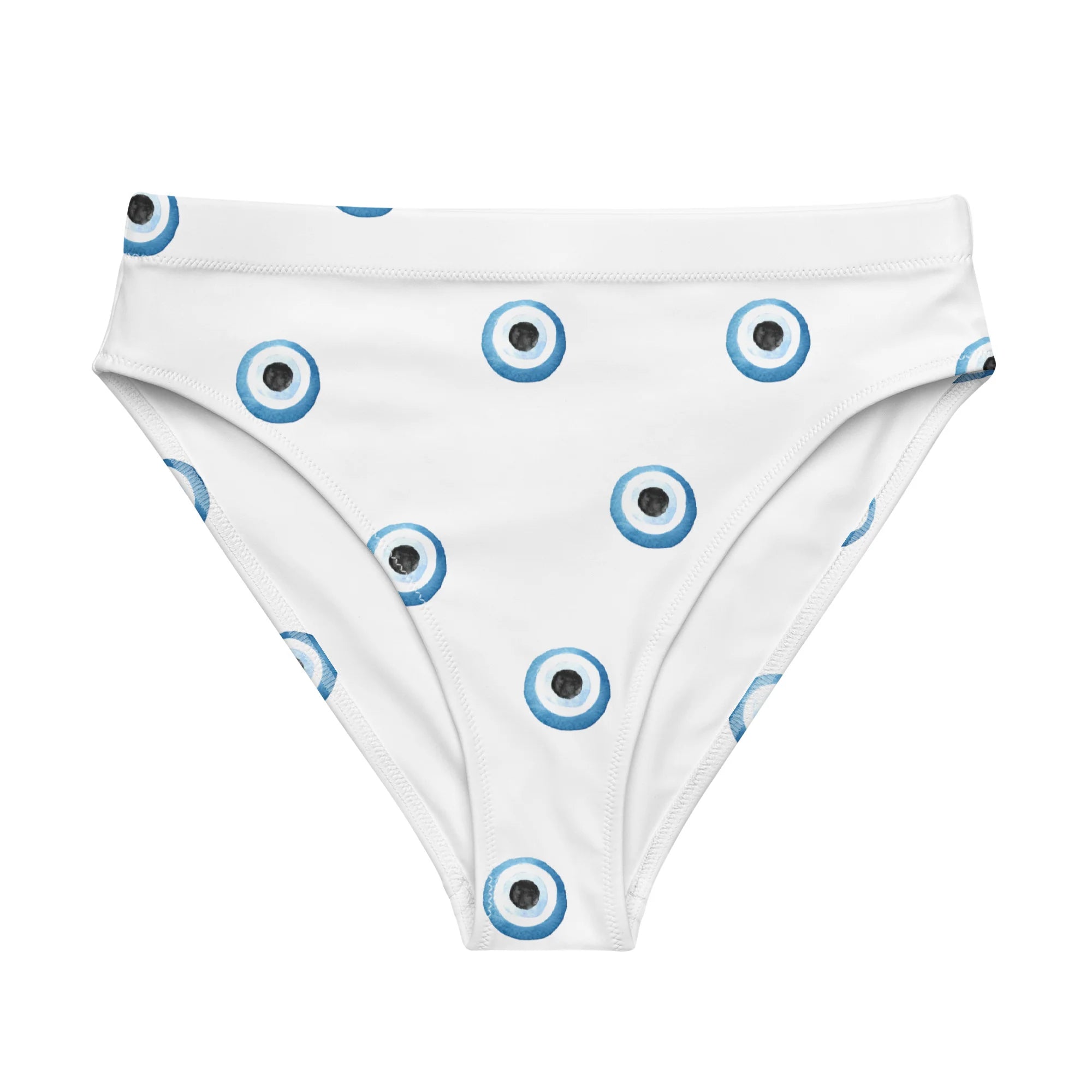 Super comfy, high-waisted, and double-layered with evil eye heart pattern—perfect for an adventurous beach day or a chill spa visit.